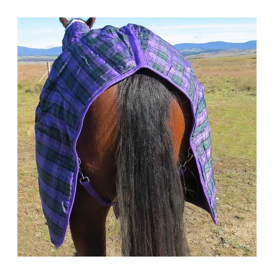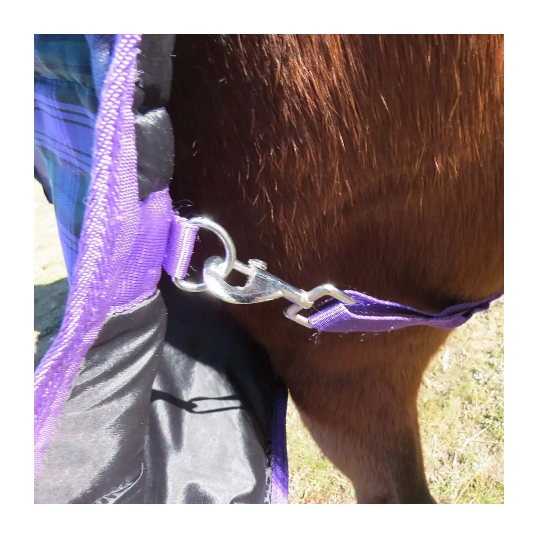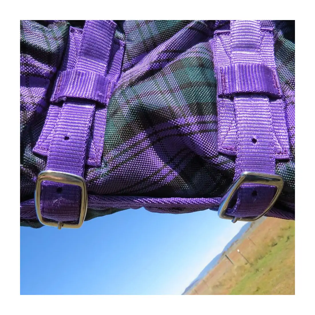 Purple / Green check stable combo horse rug Purple / Green check stable combo horse rug showing chest fit with double buckles Purple / Green check stable combo horse rug showing logo and surcingles Purple / Green check stable combo horse rug with double buckles on neck Purple / Green check stable combo horse rug Purple / Green check stable combo horse rug with steel clips on leg straps Purple / Green check stable combo horse rug showing no tail flap