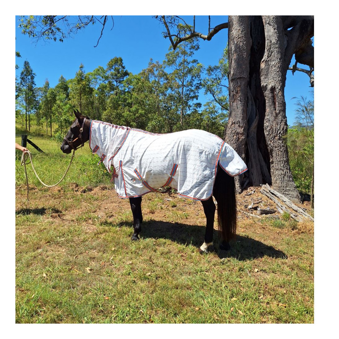 This Poly Cotton Combo Horse Rug is durable and stylish. Featuring breathable ripstop fabric, satin lining, and protection from UV rays and insects. It offers a generous fit with a large chest overlap, adjustable buckles, and a protective tail flap. Ideal for show days, traveling, and paddock use.